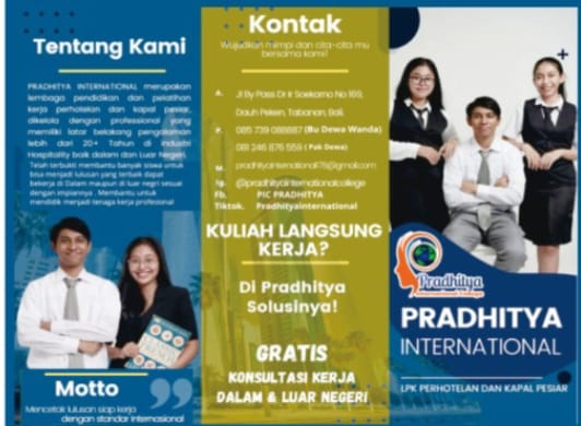 Selamat Datang di Website Pradhitya International College, Tabanan, Bali.>>>>>><<<<< Together We Achieve A Brillant Future <<<>>> Tgl. 20 dan 25 Nopember 2023, PIC Pradhitya memberangkatkan 6 orang kandidat ke Maldive. Selamat kepada : Rivaldi, Darma Adi Yoga, Puspita, Rini, Widya dan Wina. Salam Sukses