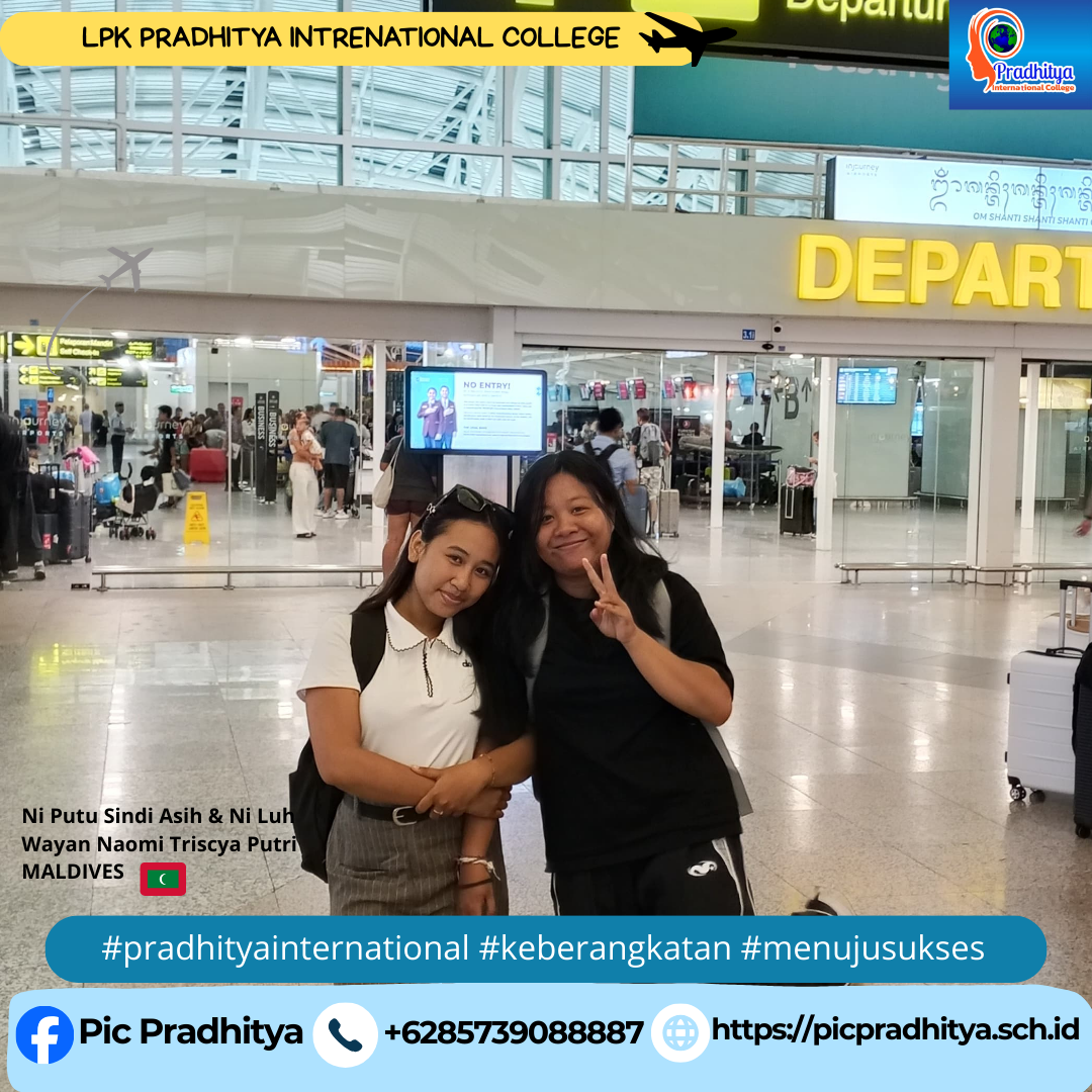 Selamat Datang di Website Pradhitya International College, Tabanan, Bali.>>>>>><<<<< Together We Achieve A Brillant Future <<<>>> Tgl. 20 dan 25 Nopember 2023, PIC Pradhitya memberangkatkan 6 orang kandidat ke Maldive. Selamat kepada : Rivaldi, Darma Adi Yoga, Puspita, Rini, Widya dan Wina. Salam Sukses